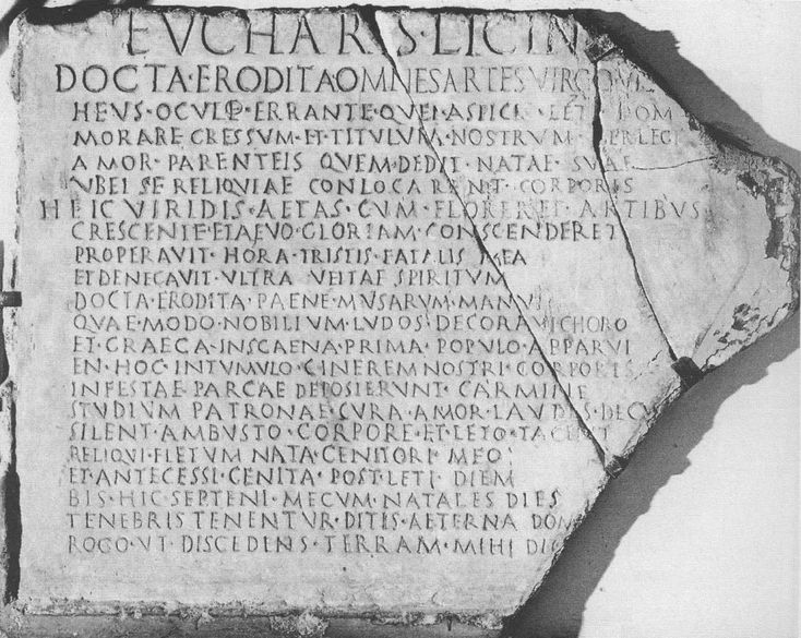 Apresentamos uma análise e tradução, inéditas em língua portuguesa, do epigrama funerário CLE 55, CIL 06, 10096, datado entre os séculos I e II a.C. e encontrado em Roma. Dedicado à liberta Êucaris Licina, o epigrama CLE 55 destaca-se pela extensão de seus versos e, principalmente, por suas reflexões e jogos metalinguísticos. Se faz, além disso, muito presente a intertextualidade que o poema traça com algumas figuras mitológicas, como, por exemplo, as Cárites, que ressoa no nome da jovem falecida Êucaris. Para a realização de nossa tradução, utilizamos o texto estabelecido por Bücheler-Lommatzsch, no Carmina Latina Epigraphica (1895), representações do texto inscrito e fotografias oferecidas pelos museus responsáveis pela preservação desses suportes. Essas informações nos permitem repensar nossa tradução, buscando reconstruir o estilo individual e recriar a poeticidade na materialidade verbal e visual desse texto.