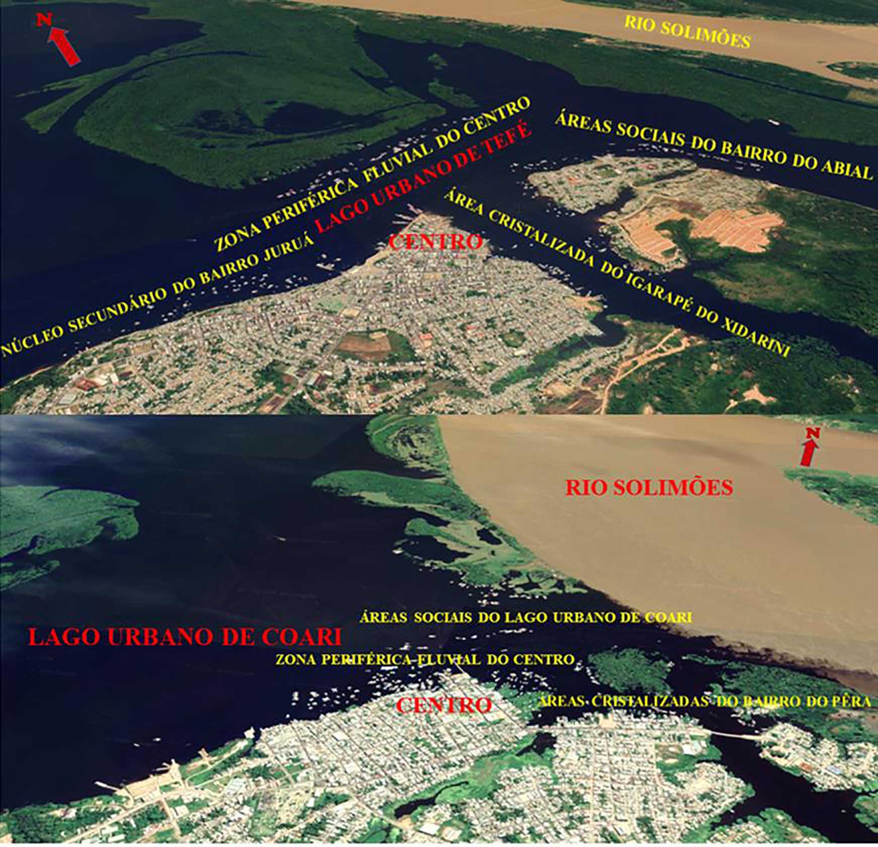 - Figura 4 - As formas espaciais dos lagos urbanos do Solimões Tefé (acima) e Coari (abaixo).