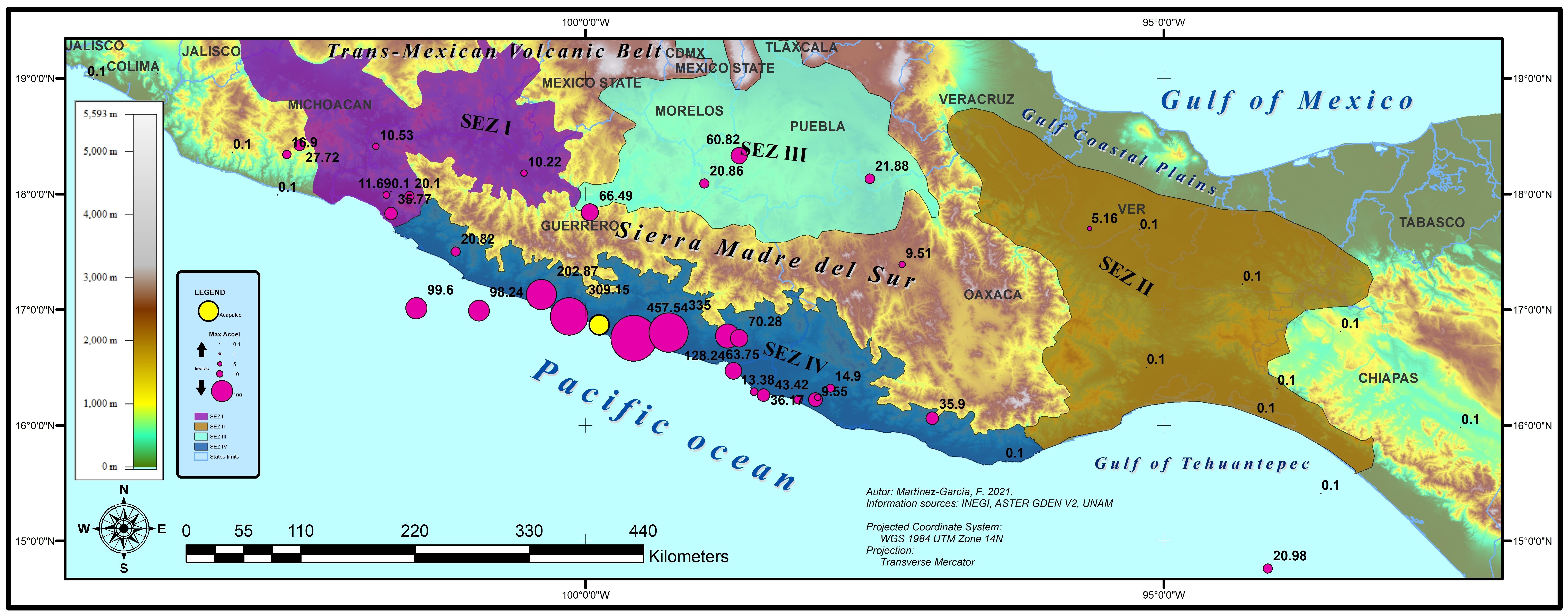 Within the framework of the “site effect” study and the spatial impact of local geographic features on seismic waves, the maximum accelerations of 45 interplate and intraslab seismic events with magnitudes (Mw) in the range of 5.6 to 8.2 that occurred from 1985 to 2018 were spatially analyzed and processed. Averages and maximum acceleration values of 172 accelerographs distributed among the territories boundaries located in the most seismic region of Mexico, are replaced the data of the scale of seismic moment magnitude (Mw) in each of the epicenters of the 45 events studied. The differential seismic impact of the topography that four Significant Epicentral Zones (SEZ) identified exert in two important cities, two tourist poles and two commercial seaports is identified. Correspondingly, the predominant orientation, direction, spatial tendency at the lithosphere level, which follow seismic waves as a result of interaction with topography within each SEZ were identified.