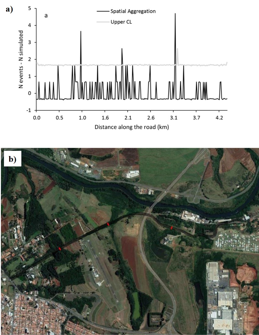 Short and narrow roads are generally overlooked when assessing road impacts on biodiversity. However, these roads bisect natural environments and may cause significant impacts on wildlife in local scale. Thus, we monitored roadkills along a short two-lane road (CPM road) in Southeastern Brazil and propose mitigation strategies to reduce wildlife mortality. We monitored roadkilled vertebrates along 5 km of CPM road from 2010 to 2016 and we also compiled data from previous studies along the same road. We conducted a hotspot analysis to identify CPM road areas with significant roadkill aggregation. We recorded 77 roadkilled vertebrates from 14 taxonomic groups along the CPM road. Mammals were the most frequently recorded group (91% of roadkills), which represented 56% of all medium- and large-sized mammal species known to occur in the study area. We identified three roadkill hotspots along the CPM road. Two of them were located at two stream crossings, where the road cut across the associated riparian forests, and the other was at a road section with water drainage from a pond, also connected to a riparian forest. These riparian forests are part of the remaining natural habitat that provides connectivity between the forest remnants in the landscape, and therefore, for wildlife. Our results showed that even short and narrow roads can have considerable roadkill, which may have severe effects for wildlife on a local scale. The results stress the need to carefully look at these types of roads and propose measures to reduce impacts. We propose the creation of safe crossing opportunities in the hotspot zones combined with wildlife fencing to keep the animals off the road and guide them towards the safe crossing opportunities.Downloads