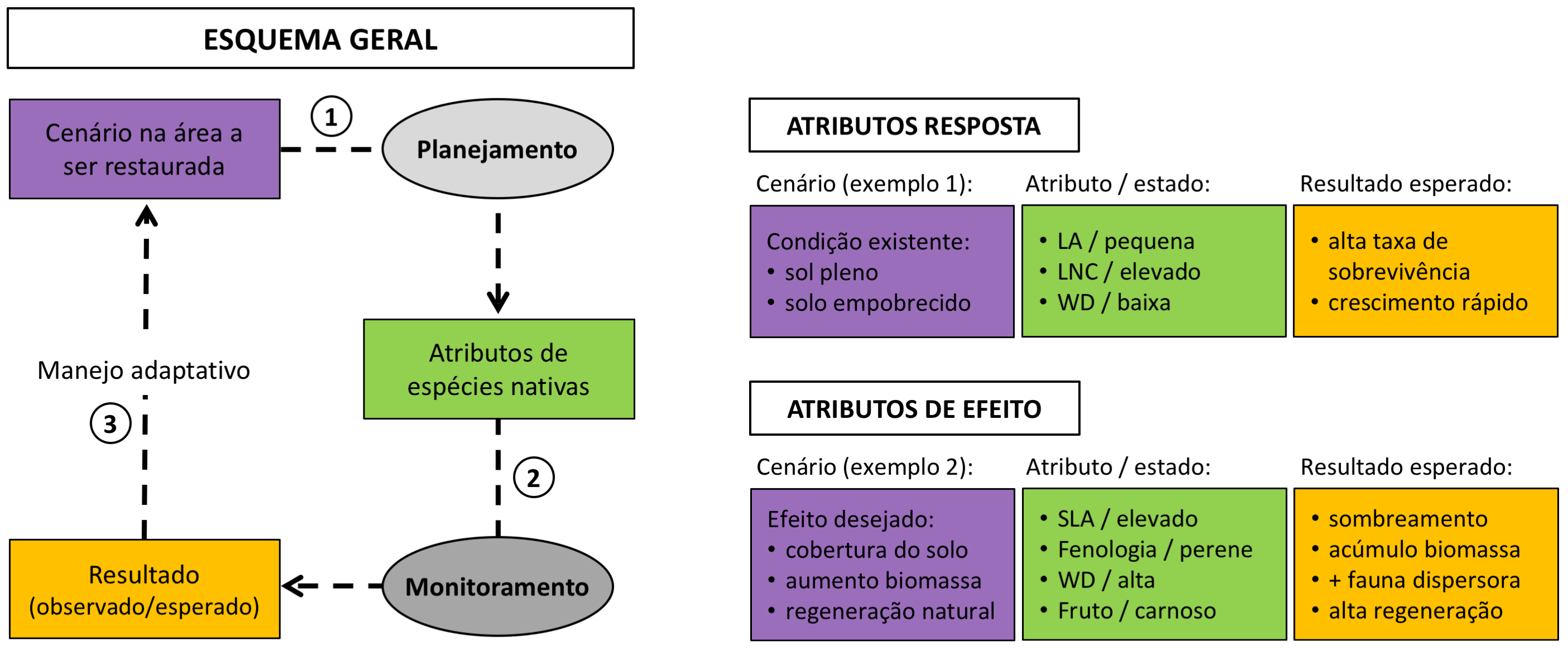 FUNCTIONAL ECOLOGY AS A TOOL FOR PLANNIG AND MONITORING ECOSYSTEMS RESTORATION: Functional ecology is an important tool in several ecological studies. Functional traits respond to environmental filters and influence ecosystem properties and functions, enabling its application in ecological studies associated with ecosystem restoration. In the present study we present how functional ecology can be applied in restoration ecology, from the planning to the monitoring phases of the project, with the focus on ecosystem functioning. First, the study contextualizes the ecological theory related to the integration of the disciplines of restoration ecology, ecosystem functioning and functional ecology. From that, we present the results of a systematic review of the literature and describe how trait-based ecology has been applied in the planning and monitoring phases of restoration projects. In the planning phase functional ecology helps in selecting species based on their characteristics, considering environmental conditions and potential filters to species development, as well as the targeted aims of restoration projects. In the monitoring phase functional traits can be used in the evaluation of ecosystem functionality, given the relationship between traits and ecological processes. We conclude indicating that it is important to focus not only on community floristic composition, but especially on the maintenance and restoration of ecosystem functions, particularly, in light of the current scenario of climate and land-use change. The integration between restoration ecology and ecosystem functioning – a common goal in ecological restoration projects – can be made through trait-based ecology approaches, increasing the effectiveness in the use of resources and the success of restoration interventions.Downloads
