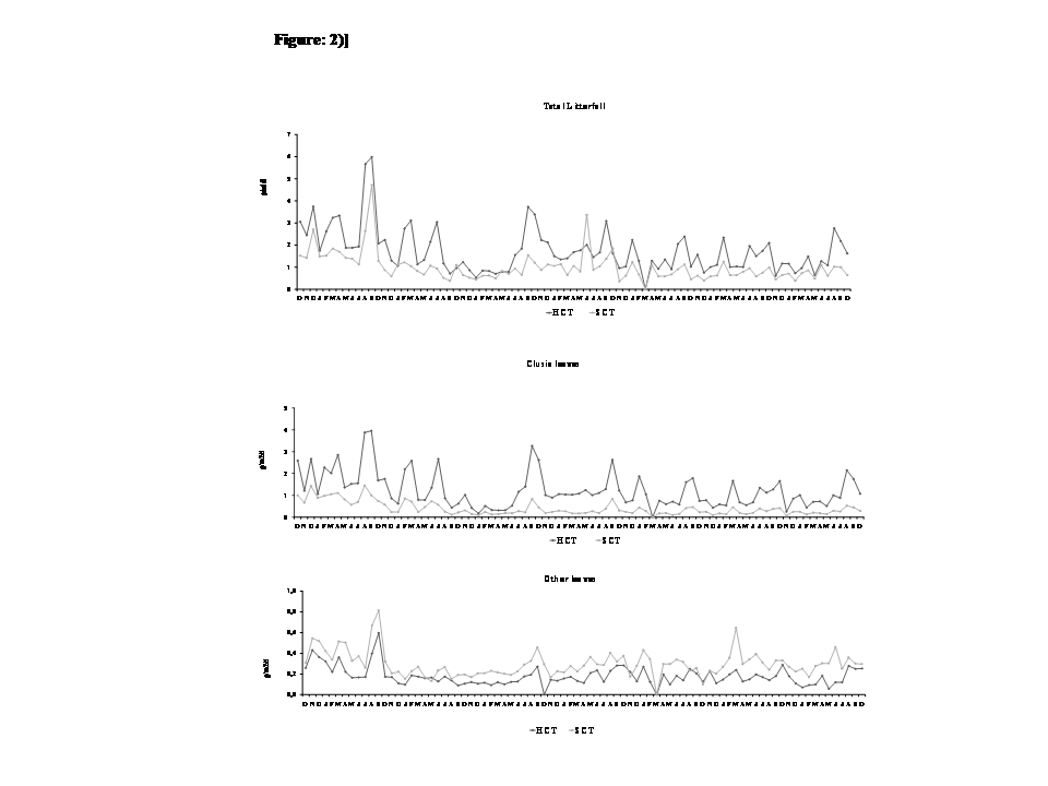 - Figure 2. Season variation of Clusia leaves (A), other leaves (B) and total litterfall (C) (g m-2 day-1) in health Clusia thickets (HCT, n=6) and senescent Clusia thickets (SCT, n=6) from 14th October 2001 to 30th October 2008, at Jurubatiba Restinga Nat