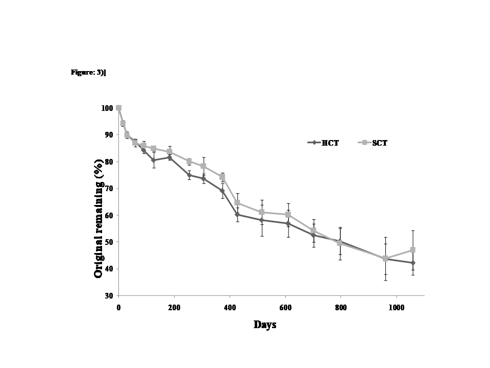 - Figure 3. Percentage (x +- SD) original dry mass remaining with time (d) in Clusia hilariana leaves in HCT and SCT on Jurubatiba Restinga National Park, RJ, Brazil