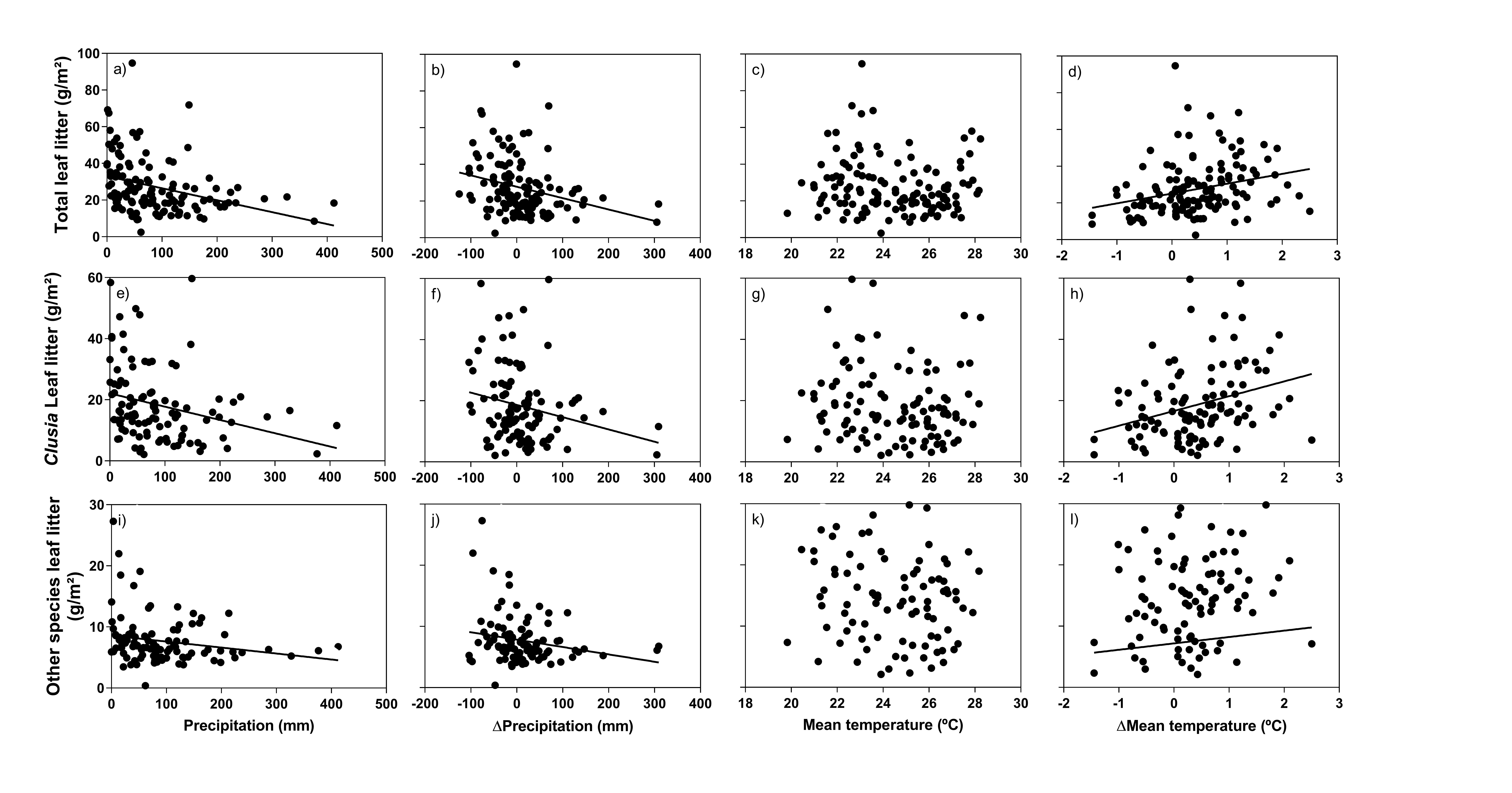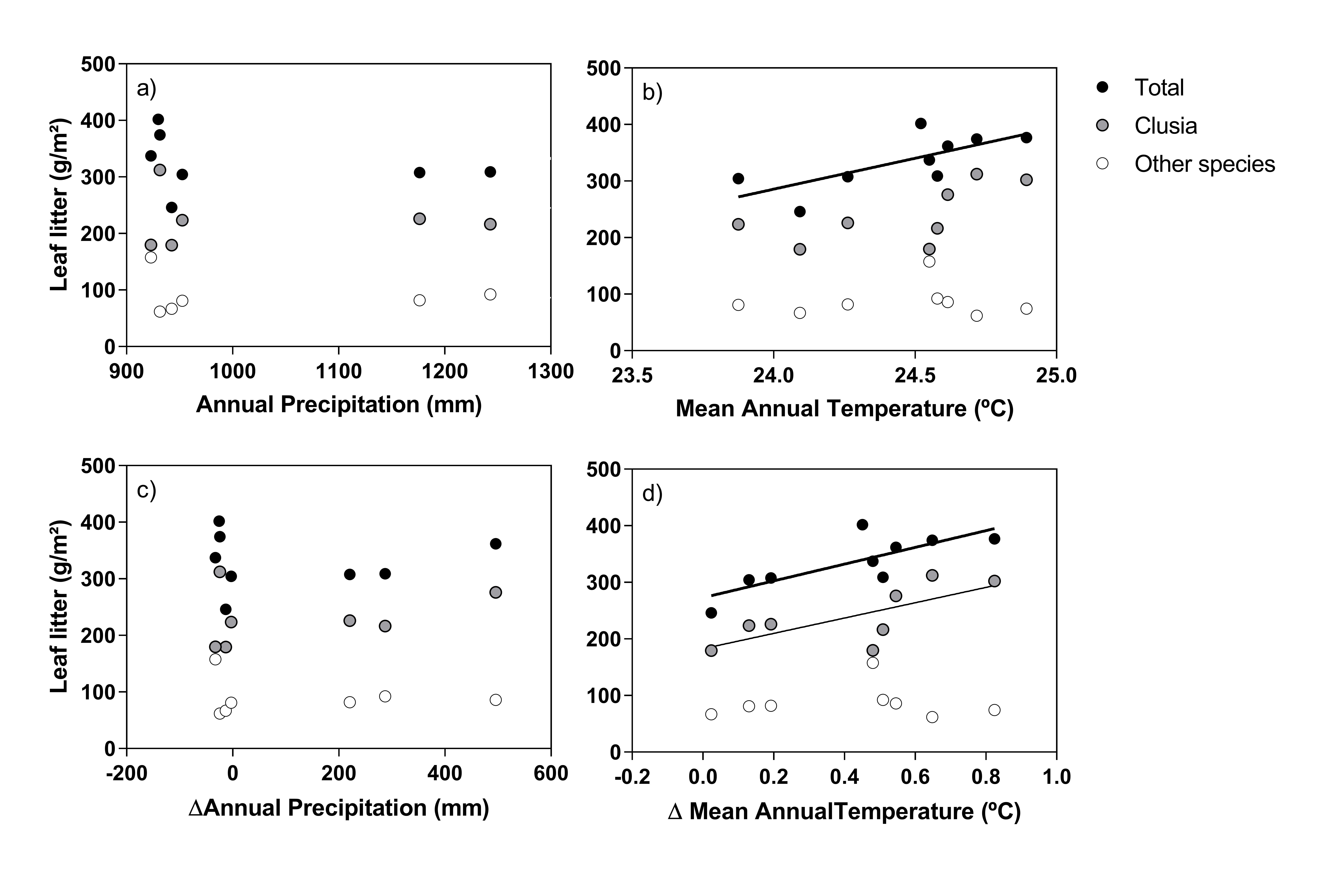 - Correlation between Total, Clusia-specific and Other species annual litterfall and annual Precipitation, ΔAnnual Precipitation, Mean Annual Temperature and ΔMean Annual Temperature