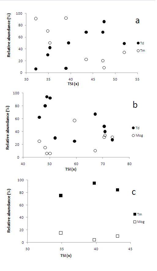 USO POTENCIAL DE CYCLOPOIDA (CRUSTACEA, COPEPODA) COMO INDICADOR DE ESTADO TRÓFICO EM RESERVATÓRIOS TROPICAIS. Cinquenta e três reservatórios do estado de São Paulo foram amostrados, em suas regiões pelágicas, no projeto “Diversidade de zooplâncton em relação à conservação e degradação dos ecossistemas aquáticos do estado de São Paulo” vinculado ao programa Biota/Fapesp (1999-2003). Estes reservatórios tiveram seus índices de estado trófico (IET) calculado com base nos valores de fósforo total e clorofila a, e suas populações de Copepoda Cyclopoida foram calculadas, considerando-se a riqueza e a abundância relativa para as espécies dominantes. A riqueza de espécies não apresentou relação com o estado de trofia dos reservatórios. Nove espécies de Copepoda Cyclopoida foram dominantes em algum reservatório onde a espécie Thermocyclops decipiens foi a que dominou o maior número de reservatórios, seguida por T. minutus, Mesocyclops ogunnus, T. inversus, T. iguapensi, Microcyclops anceps, Tropocyclops prasinus, Microcyclops alius e Mesocyclops longisetus. As espécies mostraram uma alta correlação negativa entre si, acima dos 85%, principalmente entre as espécies congenéricas de Thermocyclops. As espécies mostraram um grande potencial como bioindicadores com a seguinte relação entre TSI e espécie: Thermocyclops decipiens e Tropocyclops prasinus indicam sistemas mesotrófico/eutróficos; Thermocyclops inversus e Microcyclops anceps indicam sistemas oligotrófico/mesotróficos; Thermocyclops minutus e T. iguapensis indicam sistemas oligotróficos e Mesocyclops ogunnus indica sistemas eutróficos.