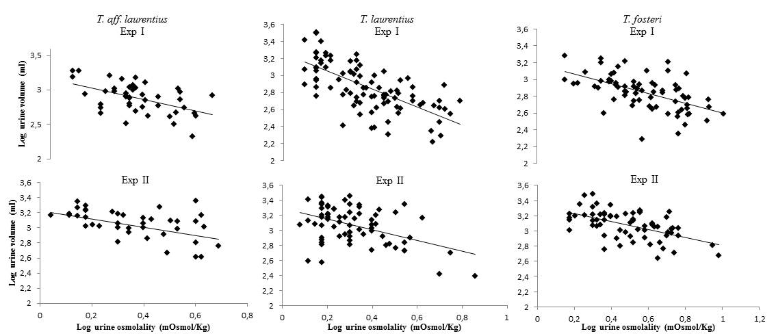 We tested the water conservation ability of three species of the genus Trichomys that occur in localities with very different climatic regimes, T. fosteri (Pantanal -- seasonal wetlands), T. aff. laurentius (Cerrado - savanna) and T. laurentius (Caatinga -- shrub land). Individuals were submitted to laboratory urinary concentration experiments using two treatments: one where food and water ad libitum were offered (control experiment - I) and the other of food and water deprivation (test experiment - II). Experiments were conducted during 24 hours and urine volume was collected and measured every 6 hours. We compared the differences in body mass, body mass loss (BML), urine volume (UV), relative urine volume (UVr) and urine osmolality (UO) between treatments for each species and between species for the test experiment (II). The patterns of temporal variation in urine concentration were also analyzed during the experiments. T. fosteri has signifcantly higher body mass than the other species. Signifcant differences were found in UV, UVr and UO but not in BML when experiments I and II were compared. Interspecifc comparisons showed no differences between species, except for UV, which was correlated with body mass and was higher for T. fosteri. All species presented low mean urine concentration values (T. aff. laurentius = 1226.14À608.03 mOsmol/kg, T. laurentius= 1210.02À662.68 mOsmol/kg, T fosteri= 1301À541 mOsmol/kg) compared to other South American rodents. All species showed high intraspecifc variability. Some individuals of T. laurentius reached values of UO higher than 3000mOsmol/Kg. The temporal patterns of urine concentration from experiments I and II were very similar for all species. Changes in the pattern of urine concentration over time were not obser- ved when comparing experiments I and II. The Thrichomys species studied here seem not to have effcient mechanisms for urine concentration. However, based on the high individual variability and the lack of changes in the short-term temporal variation, this question has to be better analyzed.Downloads