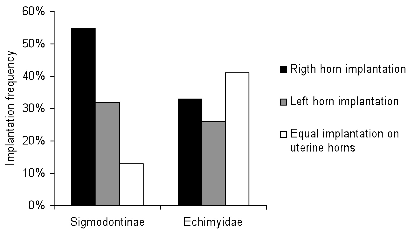 Research on the biology of Neotropical small mammals has increased in recent decades, and many studies have emphasized ecological and population attributes, but information on reproduction is still scarce. Reproduction is one of the most important natural history attributes because it is tied to almost every structural, physiological and behavioural adaptation of an individual or a species. Most research on rodent reproduction concentrates in temperate areas and there is an evident lack of data from the Neotropical region. We compared reproductive patterns of sigmodontine and echimyid rainforest rodents. We obtained necropsy data from 135 specimens collected in the field and belonging to 22 species of sigmodontine and 8 species of echimyid rodents. We estimated embryonic litter size by counting the number of embryos or the number and placement of placental scars in pregnant and parous females. Although smaller in body size, sigmodontines have larger litter sizes (3.6 À 1.2) than echimyids (2.1 À 0.7), indicating a tendency toward r and k reproductive strategies, respectively. Embryonic litter size in pregnant females was not statistically different from the number of placental scars, so the latter is a reliable estimate of the former in both sigmodontines and echimyids. Embryo implantation is asymmetric regarding uterine horns in sigmodontines, with predominance in the right horn, but not in echimyids. The relevance and biological implications of such patterns are still unknown.