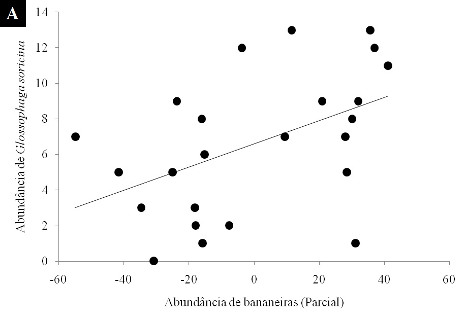 Foraging patterns and diet of different species can change during the year in relation to food resources availability, which can influence abundance and richness of organisms. The greater the abundance of a particular food resource, we expect greater abundance of species that feed on it, and the greater the diversity of food resources, we expect higher species richness. Fruit crops can attract frugivorous and nectarivorous that feed on these plants. In banana plantations it was found greater abundance of frugivorous and nectarivorous bats than in forest fragments. The aim of this study was to determine whether the abundance of food resources influences the abundance and richness of bats, and particularly frugivorous and nectarivorous guilds, in banana plantation areas. Twelve banana plantations were selected in the southwest of Rio de Janeiro State. Each area was sampled twice, at an interval which varied from five to seven months. Bat sampling was performed using mist nets opened all night and food resource was estimated using plots, in which the number of banana trees and inflorescences of banana were recorded. We obtained 1,606 captures of 22 bat species. The abundance of Glossophaga soricina, a nectarivorous species, and of all nectarivorous bats, as well as the abundance of the frugivorous species Artibeus lituratus and of all frugivorous bats, were positively related to food resources abundance. Bat richness in turn did not show this relationship. These results indicate that the amount of food available in these plantations influences their use by bats. Despite bat feeding preference for certain families of plants, these interactions are not unique and they are able to adapt to other foods source. This result further supports the hypothesis that resources diversity is more important to keep higher diversity of bats than high abundance of a single resource.Downloads
