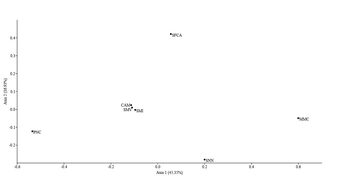 The Upper Montane Forests are located in environments with in high structural, soil and climatic variations and considered as indicative of susceptibility to potential weather changes. However, the floristic and biogeographical knowledge of this vegetation type are still scarce. Therefore, as the beginning of understanding the functioning of forest autoecology in this environment, we conducted a floristic and structural survey of woody component of a Dense Rain Forest in the Upper Montane from Caparaó National Park, establishing the floristic links between this community and others that have occurrence of similar phytophysionomies. For sampling of vegetation, we allocated 10 transects with 50x2m each, in three different portions in the Park, in the locality called Macieira. All individuals of woody layer were measured (DBH ? 2,5cm). We founded 356 individuals of 40 species. The most important in terms of dominance among the population studied were Myrsine coriacea and Symplocos pubescens with 14.68 and 14.02%, respectively. The Shannon Diversity (H') was 2.79 nat.ind-1 and Pielou Evenness (J) 0.76. Given our results, this Upper Montane Forest has floristic constitution and structural organization inconsistent with its other Upper Montane Rain Forest in the country. The geographical distance and isolation by grassland environment makes this an "island" determined by floristic differentiation and structural organization.