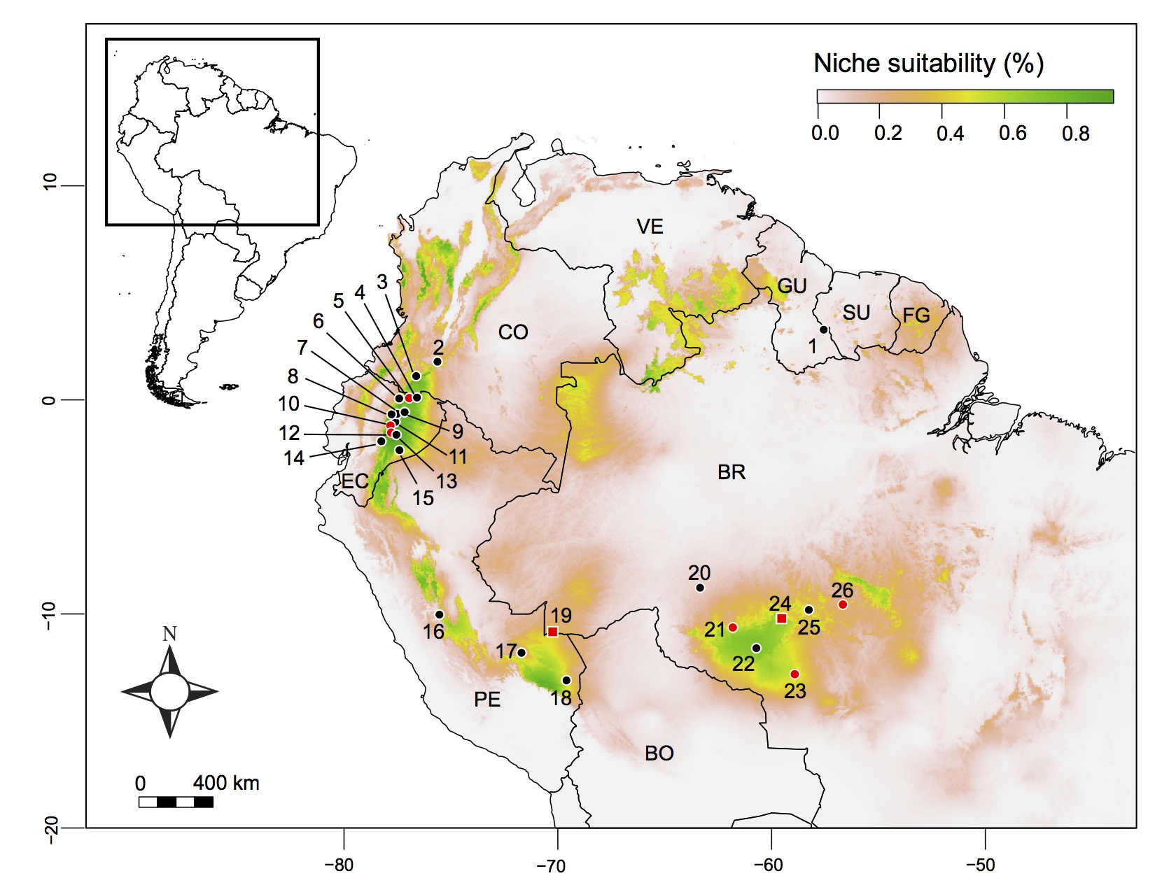 Ninia hudsoni is a small neotropical snake with cryptic habits. Its distribution range is currently based on scattered literature records from Brazil, Ecuador, Guyana and Peru. Here we present an updated distribution map of N. hudsoni with two new records from southern Amazon and six unpublished records found in herpetological collections. We also implemented an ecological niche modeling (ENM) to predict climatically suitable areas for the occurrence of N. hudsoni. Both historical records and ENM support that N. hudsoni is restricted to the north, south and west edges of the Amazon. Southern Venezuela and northwestern Colombia seem to be the major gaps that lack occurrence records of N. hudsoni.Downloads