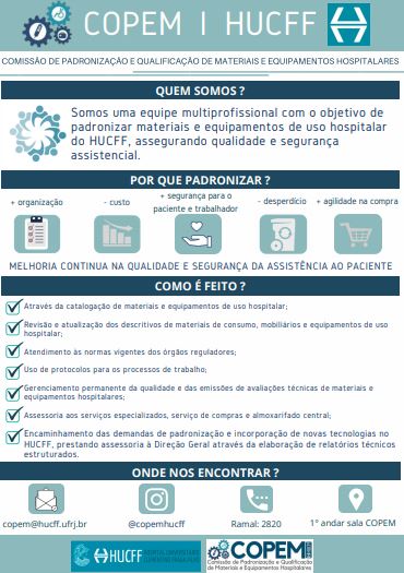 Introdução: A pandemia de Covid-19 deixou diversos trabalhadores afastados de suas atividades laborais, devido às medidas de isolamento e distanciamento social, principalmente dentre os pertencentes aos grupos de risco da doença. Neste contexto foi criado o programa de voluntariado dos acadêmicos do Centro de Ciências da Saúde no Hospital Universitário Clementino Fraga Filho. Objetivos: Identificar as ações desenvolvidas pelos acadêmicos do programa de voluntariado para o enfrentamento do COVID-19 no âmbito da COPEM e analisar a experiência do voluntariado para o enfrentamento da COVID-19 com relação à trajetória acadêmica dos voluntários. Métodos: Participaram do programa acadêmicos de cursos de saúde de forma voluntária. A Comissão de Padronização e Qualificação de Materiais e Equipamentos Hospitalares (COPEM) realizou reuniões virtuais e presenciais e criou planos de ação e objetivos. Resultados: O grupo produziu ferramentas didáticas para internet, fluxogramas e infográficos, além de ensinamentos sobre gestão hospitalar. Conclusão: Foi possível concluir ganho de conhecimento por parte dos voluntários tanto na vivência quanto na produção de ferramentas de gestão hospitalar.