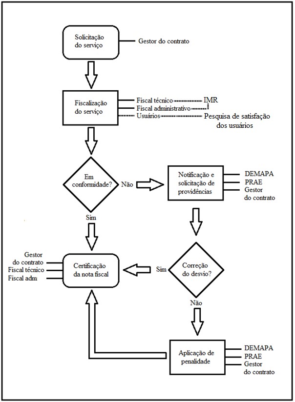 Este estudo tem como intuito propor melhorias na Gestão de Contratos dos Restaurantes Universitários da Universidade Federal de Santa Maria (UFSM) a fim de cumprir as cláusulas contratuais de avaliação do serviço pelo público usuário. Para atingir o objetivo traçado, foi realizado um mapeamento de processos da gestão de contratos. O processo de coleta de dados tem abordagem qualitativa e foi realizado através da aplicação de entrevista do tipo semiestruturada. Os resultados foram apreciados mediante técnicas de análise de conteúdo e revelaram que os gestores da UFSM têm interesse no desenvolvimento de uma metodologia de avaliação dos serviços pelo público usuário através de pesquisas de satisfação atreladas ao Índice de Medição de Resultados (IMR). Destacou-se a necessidade de composição e de capacitação das equipes de gestão de contratos dos RUs. Adicionalmente, foi proposto um plano de ação para melhoria do desempenho desses processos, utilizando-se a técnica 5W2H.