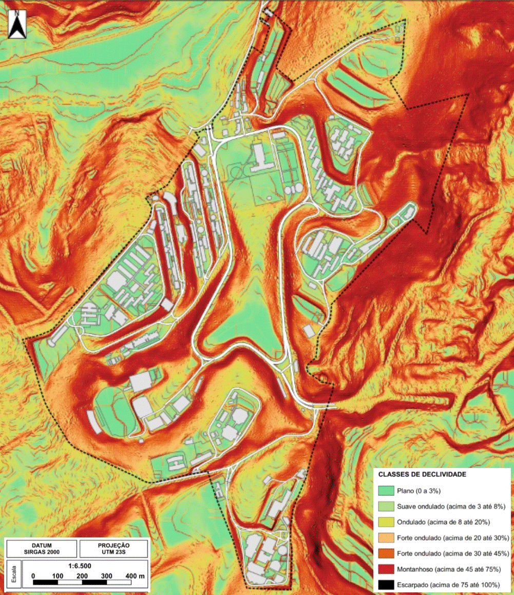 Assim como as cidades, os campi universitários podem se apropriar do plano diretor como instrumento de planejamento, já que tais arranjos espaciais são perpassados por questões e problemáticas semelhantes. Diante disto, o presente trabalho tem como objetivo discutir a caracterização do relevo do campus sede da Universidade Federal de Juiz de Fora, por meio de um Modelo Digital de Elevação (MDE) desenvolvido em Sistema de Informações Geográficas (SIG), como subsídio à construção do plano diretor da instituição. Quanto aos procedimentos, o estudo se delineia como Pesquisa bibliográfica, Pesquisa documental e Pesquisa-ação. O MDE foi construído por meio de interpolação de curvas de nível, a partir de shapefile obtido junto à Prefeitura de Juiz de Fora (MG). As análises foram subsidiadas pela construção de mapa altimétrico e mapa de declividade. Constatou-se que que 34% da área do campus apresenta declividade acima de 30% não sendo, portanto, propícia à ocupação de caráter urbano. Áreas planas, mais favoráveis à ocupação, representam 25% do total, sendo que a maior parte delas já se encontram ocupadas.