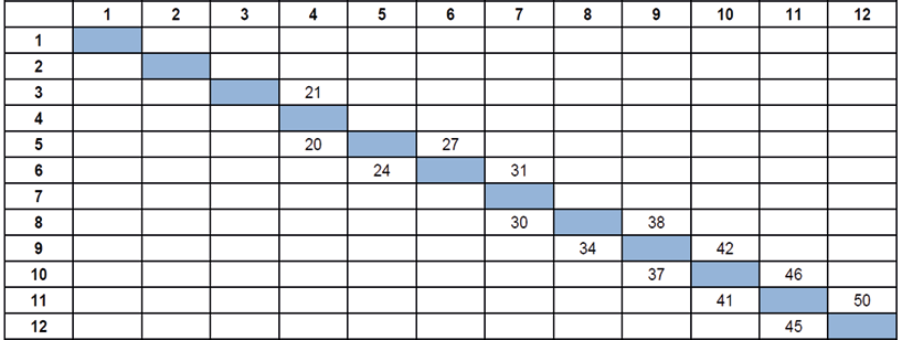 A Matriz de Governança utiliza linhas e colunas que representam as atividades do processo na ordem em que são executadas. No entanto, a Matriz de Governança utiliza apenas os elementos de orientação e feedback, não considerando os elementos de entrada e saída. Cada linha representa uma atividade, e as células da matriz que correspondem às colunas representam as atividades que fornecem orientação ou feedback. A célula marcada abaixo da diagonal da matriz indica informações de uma atividade anterior que gera uma restrição para a subsequente, e esses elementos podem causar atrasos. Já a célula marcada na metade superior indica um feedback, onde informações de uma atividade posterior podem atuar como feedback para uma anterior, e esses elementos podem causar interrupções.