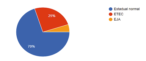 Essa constatação se confirma na pesquisa através do questionamento sobre a escolaridade dos alunos (Gráfico 2) e sobre a tipologia de escola que frequentaram (Gráfico 3). Como se pode observar, no Gráfico 2, mais da metade dos entrevistados já se formou, sendo uma minoria dos estudantes do CPES que ainda frequentam a Escola. Nesta pergunta, evidentemente não se questionou sobre a possibilidade de os respondentes possuírem Ensino Superior, justamente por estes indivíduos estarem em um curso preparatório para o vestibular. Já no G ráfico 3, a grande maioria dos estudantes frequenta ou frequentou uma escola estadual, um quarto escolas técnicas, e um respondente pertence ao EJA.