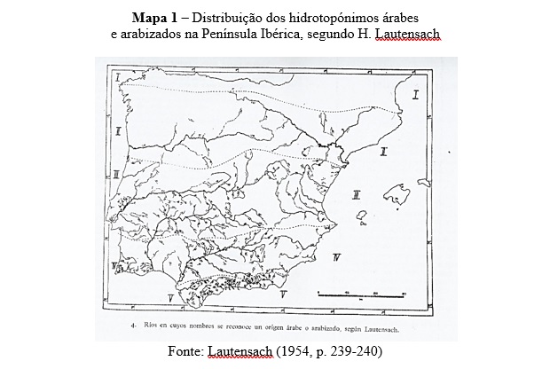 - Mapa 1 – Distribuição dos hidrotopónimos árabes e arabizados na Península Ibérica, segundo H. Lautensach