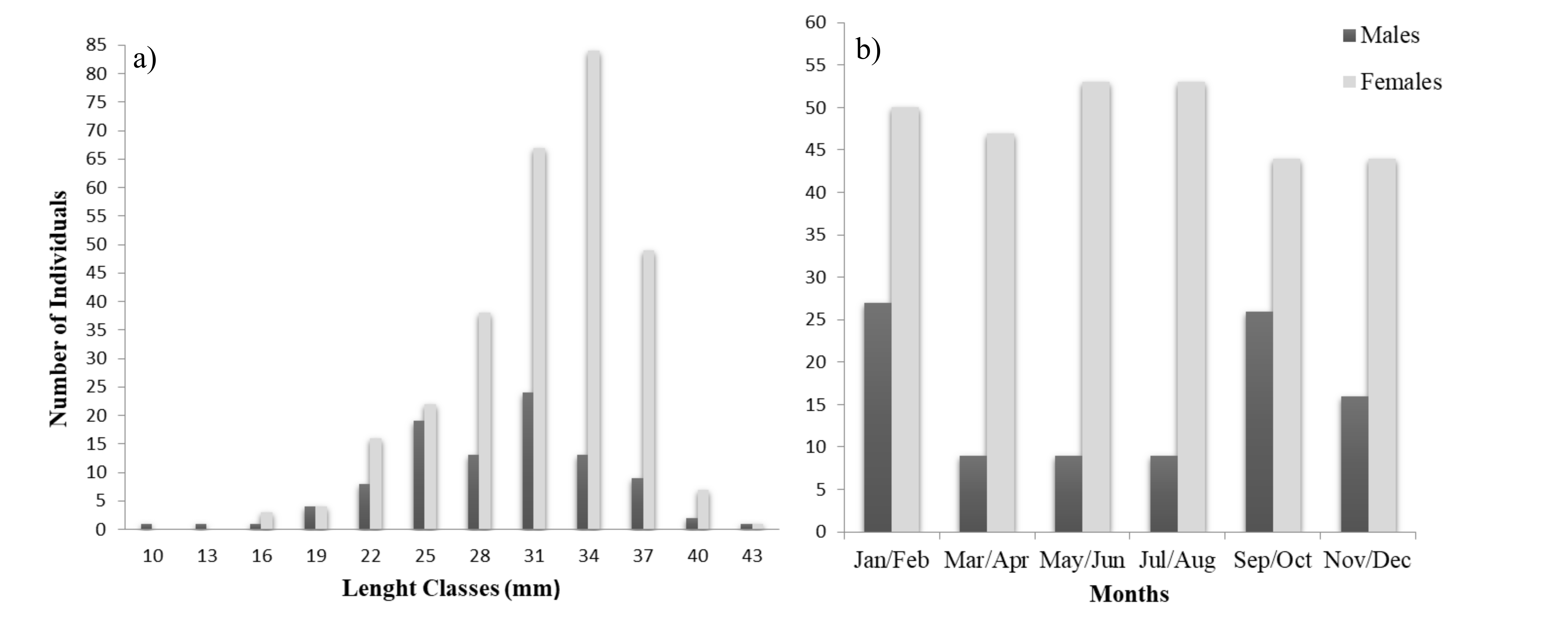Population dynamics allows comprehension on how population assures its success on continuity of the species and the balance of its population density. Thus, in order to analyze reproductive parameters (i.e., gonadal maturation stages, fecundity, and recruitment) and population aspects (i.e., length-weight frequency, asymptotic length, growth and mortality rates, and sex ratio) of Odontostilbe paraguayensis Eigenmann & Kennedy (1903) (Characiformes: Characidae) in the southern Pantanal of Brazil, samples were carried out from February 2009 to January 2011 along the main channel of the Paraguay River and its tributary, the Amonguijá River, with seine net and a rectangular sieve (0.8 x 1.2 m). To estimate population parameters, the data of 604 individuals were recorded, and for reproductive aspects, the data of 394 individuals were recorded. The sex ratio was 3:1 (females:males). The estimated asymptotic length (L∞) was 36.67 mm. The population had high growth rate values (k = 1.3 year-1) and mortality (Z = 1.98). Longevity was estimated as 2.3 years. The mean absolute fecundity was 420.2 oocytes/female. Absolute fecundity was positively related to total weight (g) and gonad weight (mg). For females, the standard length at first maturity (L50) was 24.1 mm, and for males, it was 27.6 mm. Reproducing females were more frequent in March and April, although females with ripe gonads were recorded nearly all year long. The recruitment pattern was long with positive correlation with the average historic level of the Paraguay River, considering seasonal flooding. The lengthweight relationships were not different between the sexes, but they presented negative allometric growth. Thus, during ontogeny, the species presents more increment in length than in weight, and, consistent with the high growth rate, this may be understood as a way to reach longer lengths faster to avoid predation. The outcomes demonstrate that O. paraguayensis has a short life cycle with high growth and mortality rates. Together with the long recruitment pattern and high fecundity, the species may be considered an r-strategist.