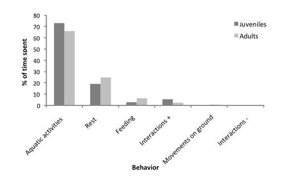 The capybara, Hydrochoerus hydrochaeris (Rodentia, Caviidae), is a species adapted to diverse environments, including urbanized areas, where its populations can reach high densities. In this study, we searched the behavioral pattern of capybaras in urban areas, and investigated the effect of temperature and relative humidity in its activity pattern. The study was conducted in an urban area of the Aquidauana municipality in the state of Mato Grosso do Sul, Brazil. Observations occurred between June 2014 and March 2015, using the scan sampling method. We found that capybaras spent most of your time in aquatic activities and rest. Temperature was positively correlated with the percentage of individuals engaged in aquatic activities. Relative humidity was negatively correlated with the percentage of individuals at rest and positively correlated with aquatic activities. Capybaras exhibit behavioral thermoregulation, which explains the large amount of time spent on aquatic activities with the increase in temperature and relative humidity.