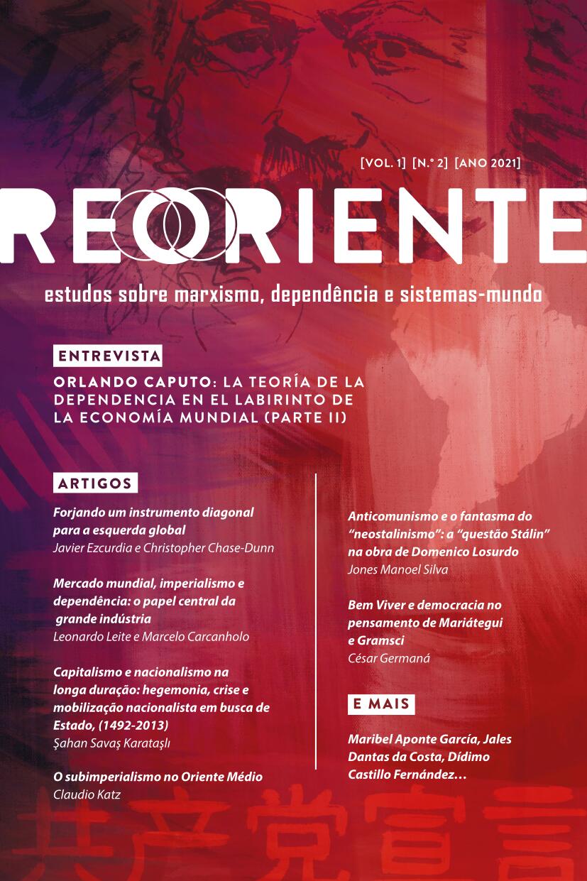 Vol. 1 No. 2 (2021)Esta edição traz a segunda parte da entrevista com Orlando Caputo, artigos de Javier Ezcurdia e Christopher Chase-Dunn, Leonardo Leite e Marcelo Carcanholo, Sahan Savaş Karataşlı, Claudio Katz, Jones Manoel Silva e César Germaná. Inclui ainda homenagens a Anibal Quijano, Marco Gandasegui, hijo e Norman Girvas e resenhas dos livros Dependency, Neoliberalism and Globalization in Latin America, de Carlos Eduardo Martins e Friedrich Engels:Uma Biografia, de Gustav Mayer